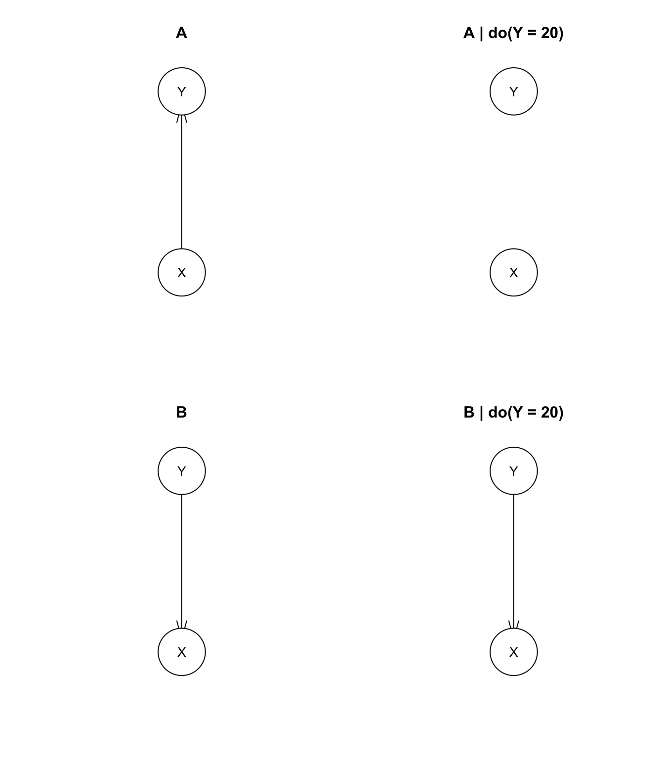 (A | do(Y = 20)) \[ \begin{align*} X &= \beta_{10} + \epsilon_X \\ Y &= 20 \end{align*} \]