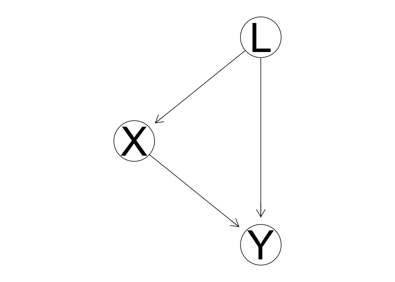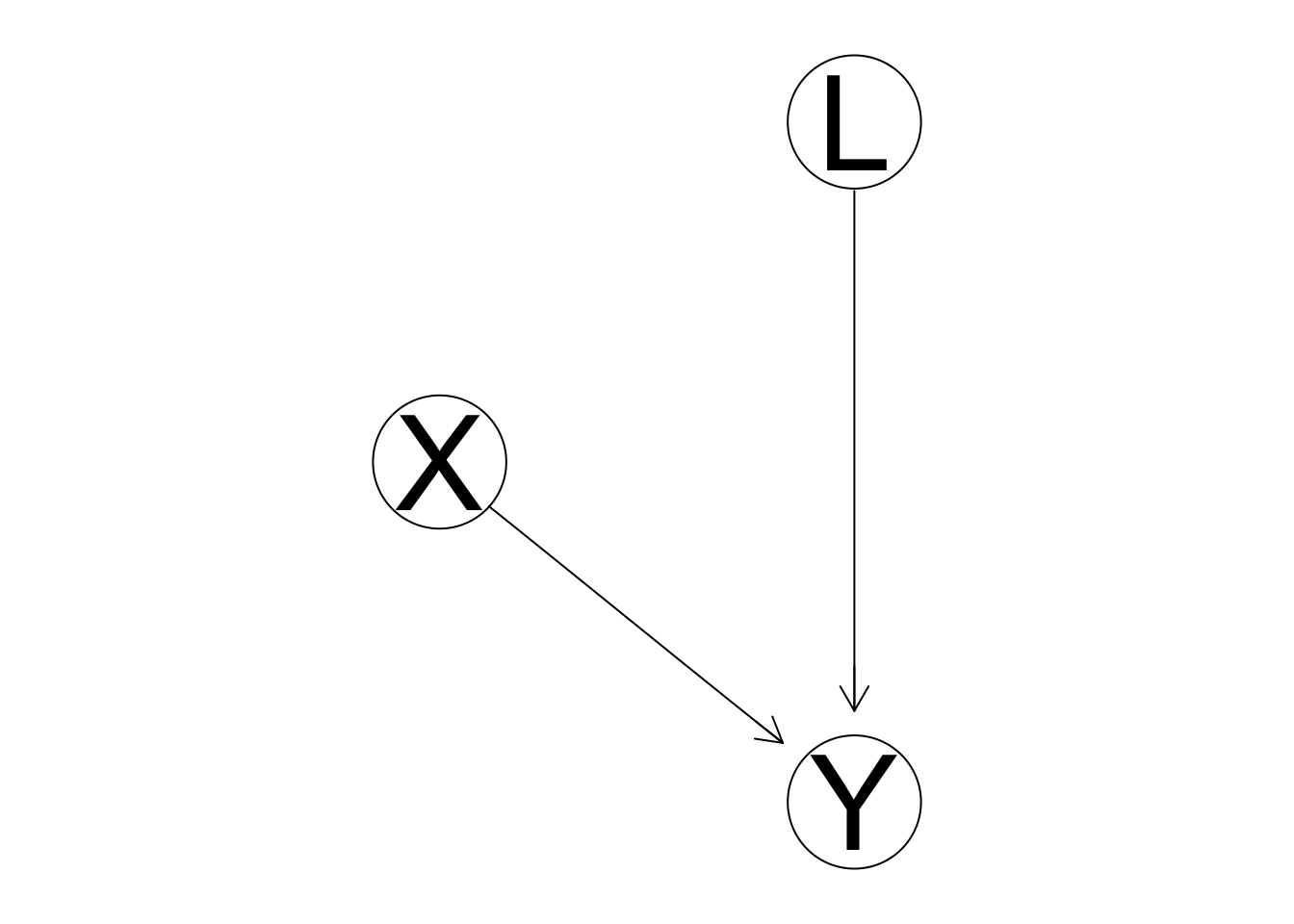 Typically, it isn’t so easy to adjust for confounders. There can be many. We have a couple options. We could find as many possible confounders as we can, adjust for them, and hope that’s enough. Another option is the gold standard in science: experimentation. One can think of an experiment as a direct measurement of the effect of intervention. Graphically, an intervention on X would sever the connection between L and X. L can no longer act as a confounder, and \(\alpha\) can be measured from the experimental data.