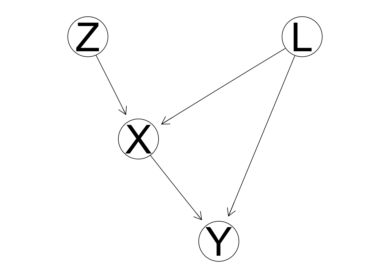 In the context of clinical trials, subjects neglecting to take the medication they were assigned is termed noncompliance. Since there can be a correlation between a subject’s noncompliance and the outcome, our experiment weakens the causal connection between X and L but it isn’t fully eliminated. The relationship between Z and Y is a good approximation to the relationship between X and Y to the extent that noncompliance can be kept low.